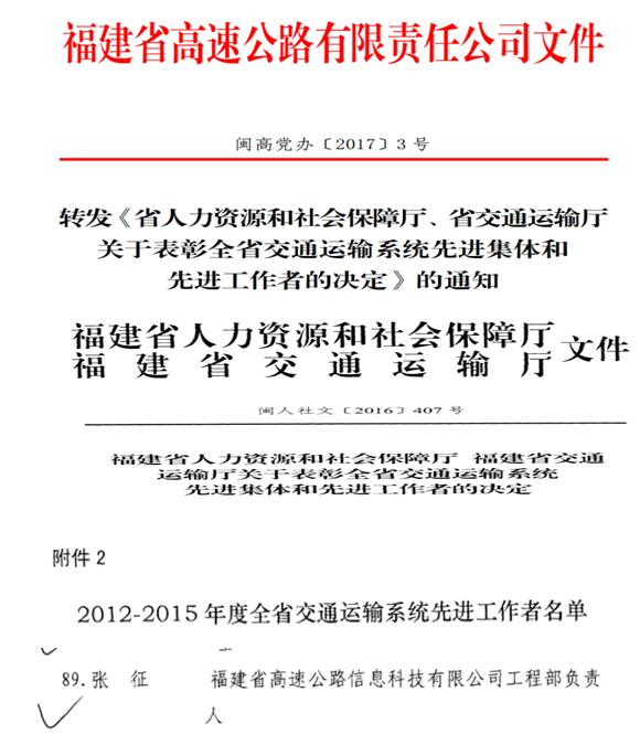 根據(jù)《省人力資源和社會保障廳、省交通運輸廳關(guān)于表彰全省交通運輸系統(tǒng)先進(jìn)集體和先進(jìn)工作者的決定》(閩人社文[2016]407號),我司工程部負(fù)責(zé)人張征同志榮獲2012-2015年度全省交通運輸系統(tǒng)先進(jìn)工作者。全司廣大干部職工應(yīng)以先進(jìn)為榜樣,緊緊圍繞公司年度工作計劃,攻堅克難、扎實工作、發(fā)揚精神,為建設(shè)高效、清新、陽光、幸福高速公路做出更大貢獻(xiàn)。