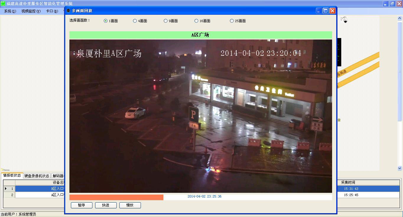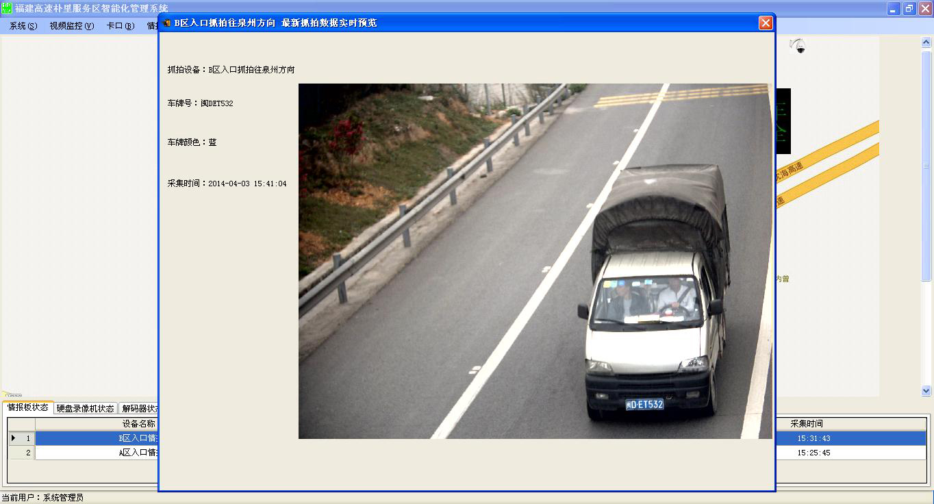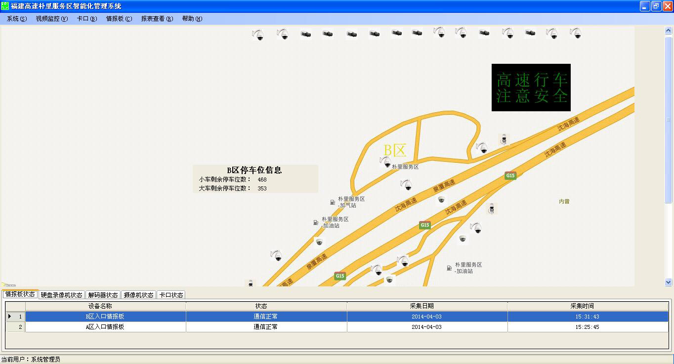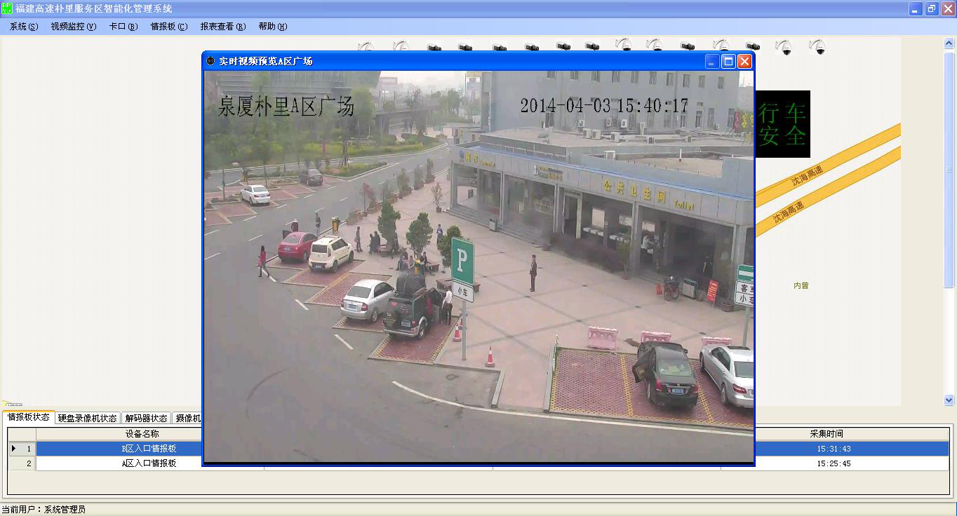 服務(wù)區(qū)智能管理系統(tǒng)為應(yīng)對高速公路服務(wù)區(qū)的安保、信息發(fā)布等集中化管理需求而研發(fā)的一套軟件系統(tǒng)。系統(tǒng)創(chuàng)新性的集合了視頻監(jiān)控、卡口抓拍監(jiān)控(包括車牌識別)、停車位計數(shù)、情報板信息管理、設(shè)備監(jiān)控和交接班管理等智能化管理功能于一體,使用戶在一套解決方案中滿足眾多需求,這不僅節(jié)約了管理時間,更使得服務(wù)區(qū)的各項組件得以協(xié)同工作,提升管理效率。本系統(tǒng)在泉州樸里服務(wù)區(qū)部署,于2014年2月26日通過