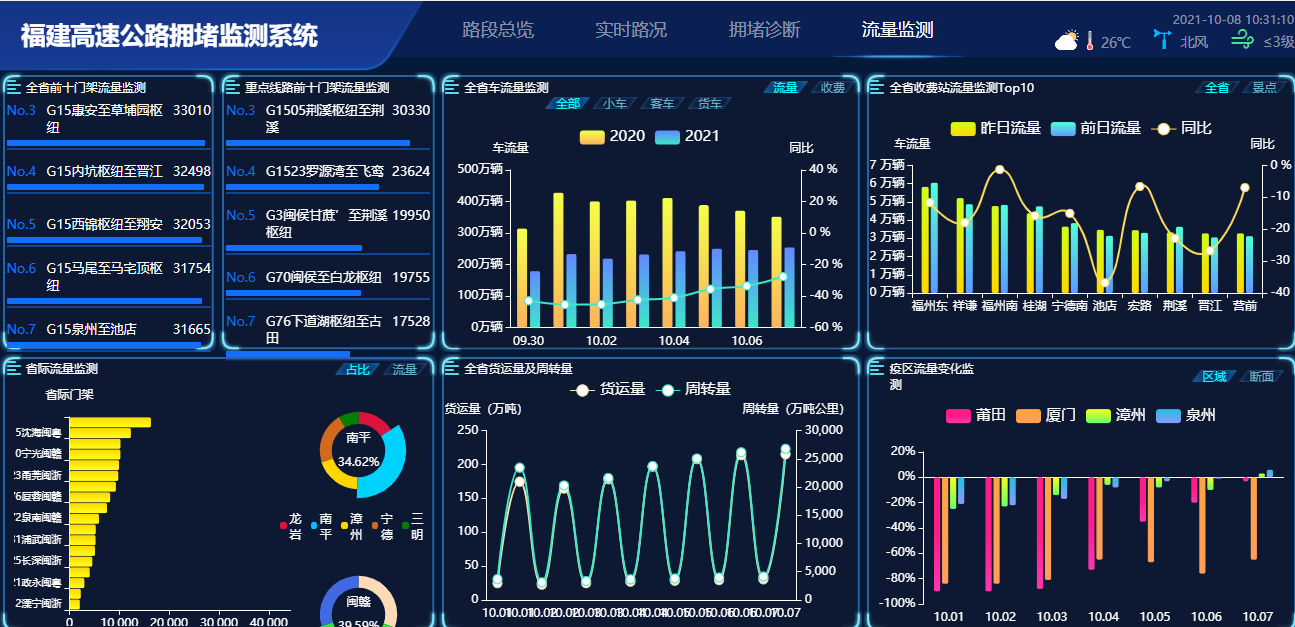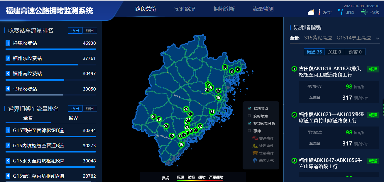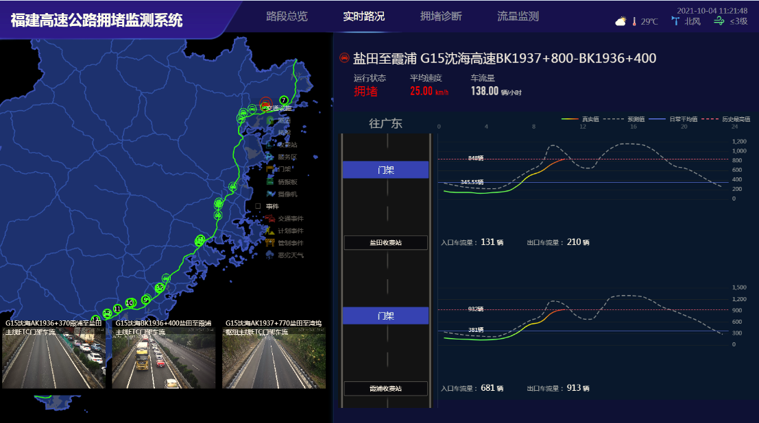高速公路擁堵預(yù)警分析系統(tǒng)實現(xiàn)“一張網(wǎng)、一屏清”,具有以下特色:一是實現(xiàn)基于ETC門架數(shù)據(jù)易擁堵路段交通狀態(tài)評估分析。系統(tǒng)實時分析計算區(qū)間交通量、平均速度,并結(jié)合易擁堵路段歷史擁堵事件特性,建立擁堵評價指標(biāo),實現(xiàn)運行狀態(tài)評估分析;二是實現(xiàn)多分辨率視頻AI智能分析。通過接入天龍山、崗山隧道視頻圖像,融合視頻AI分析技術(shù),實現(xiàn)對隧道內(nèi)車輛違停、交通擁堵等事件的及時識別,并可適應(yīng)全省隧道高清、標(biāo)清視頻圖像分辨率;三是實現(xiàn)路況局部精細(xì)化可視化展現(xiàn)。實現(xiàn)擁堵路段局部精細(xì)化展示,疊加收費站、隧道、服務(wù)區(qū)等構(gòu)造物信息,實時輪巡區(qū)間內(nèi)視頻圖像,并對路段前后收費站ETC門架交通流量進行實時監(jiān)測;四是實現(xiàn)路網(wǎng)交通流參數(shù)高精準(zhǔn)預(yù)測。利用卷積神經(jīng)網(wǎng)絡(luò)機器學(xué)習(xí)算法,通過歷史海量大數(shù)據(jù)的訓(xùn)練學(xué)習(xí),實現(xiàn)對區(qū)間流量、平均車速等指標(biāo)的較高精度預(yù)測。